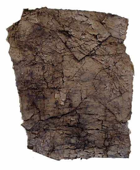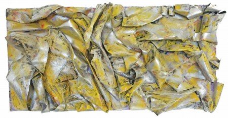 Sharon Barnes’ mixed media piece entitled Not Flat but Undulating through Time is just one of many pieces constructed from an unconventional paper product. Made from industrial roofing paper, Not Flat… assumes a sculptural quality which she achieved “through a process of cutting and tearing this heavy sheeting, then bending and shaping it.” Painted in hues of yellow and grey, the rectangular piece measuring 24” x 48” x 3” looks like a sheet of metal, crumpled and welded together like one of John Chamberlain’s assemblages constructed from old automobile parts.