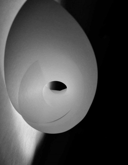 Several photographs also appear in the show including those by Jim Newberry, Patrick Ramsey, Steven Stanger, Stephanie Sydney, and John VanDewerker to name only a few. Joy Curtis Urlik’s “Paper Series” is noteworthy in that the work itself is about photographing paper which she cuts into various shapes. “By physically creating environments constructed from plain paper,” Urlik creates “work that is suggestive of organic energies found within nature.” Paper Series #4, for example, brings to mind the image of a nautilus mollusk, the only living member of the subclass nautiloidea, commonly considered a living fossil whose shell is generally smooth yet characterized by a select few whorl depressions.